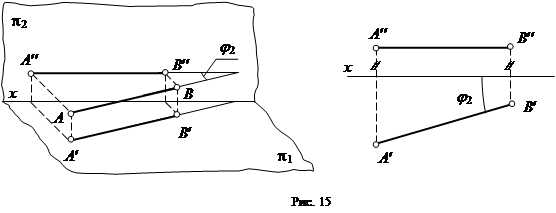 Угол j1 между фронтальной проекцией фронтальной прямой и осью x является углом между фронтальной прямой и горизонтальной плоскостью проекций.