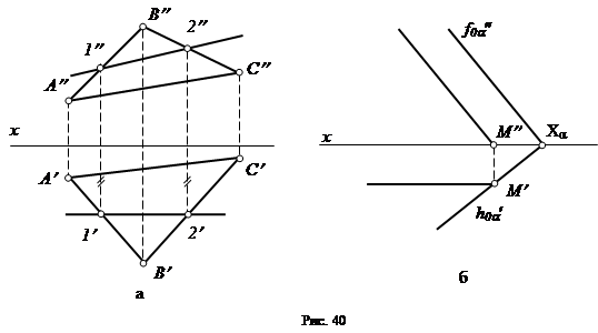 Если плоскость задана следами (рис. 39, б), то горизонтальная проекция горизонтали параллельна горизонтальному следу плоскости.