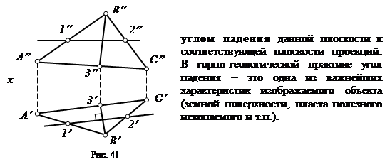 Из всех прямых, принадлежащих плоскости, линия наибольшего ската имеет самый большой угол наклона к соответствующей плоскости проекций (в нашем примере на рис. 41 – к горизонтальной плоскости проекций p1), который называется