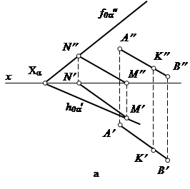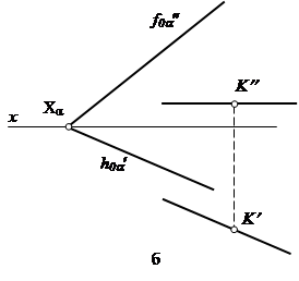 Эту же задачу, можно решить другим способом, проведя через точку К прямую частного положения, например, горизонтальную прямую (рис. 42, б). Горизонтальная проекция горизонтальной прямой проходит через проекцию К ¢ и параллельна следу h 0a¢.