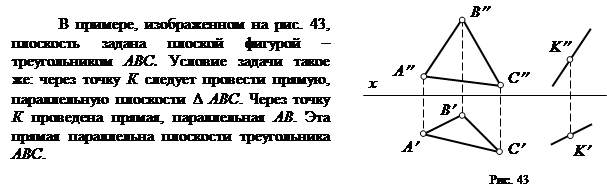 Проведем в плоскости a любую прямую, например, прямую MN (рис. 42, а). Затем через точку К параллельно MN проведем прямую АВ. Эта прямая будет параллельна плоскости a, так как она параллельна прямой MN, лежащей в этой плоскости.