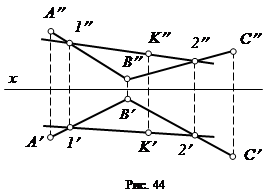 Пример 5. Построить недостающую проекцию точки К, лежащей в заданной плоскости (плоскость задана двумя пересекающимися прямыми АВ и ВС, а точка – только ее фронтальной проекцией К ¢¢, рис. 44).