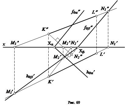 На рис. 69 дано построение плоскости b, перпендикулярной плоскости a и проходящей через прямую KL. Из любой точки прямой KL, например, из точки К, проводим перпендикуляр к заданной плоскости a. Строим следы прямой KL и перпендикуляра: проекции горизонтального и фронтального следов прямой KL (M1 ¢ и M1 ², N1 ¢ и N1 ¢¢) и перпендикуляра (M2 ¢ и M2 ², N2 ¢ и N2 ¢¢).