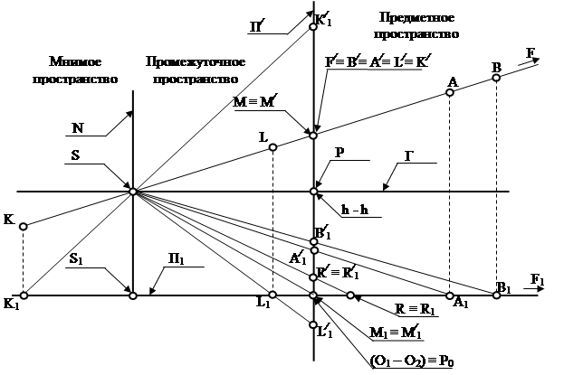 Вторичные проекции точек, расположенных в промежуточном пространстве (точка L), находятся ниже основания картины (линии O1 – O2), а расположенных в мнимом пространстве (точка К) – выше линии горизонта.