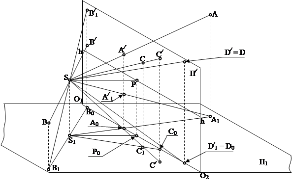 1. Из точки В опускается вертикальная линия проекционной связи на предметную плоскость П1 – получаем проекцию точки на предметной плоскости В1. Проводим след лучевой проецирующей плоскости через точки В1 и S1;