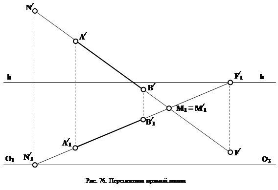 (О1 – О2), получаем вторичную проекцию начала прямой N∕1. Перспектива начала прямой N∕ найдется как точка пересечения вертикальной линии проекционной связи из точки N∕1 с продолжением перспективы прямой А∕В∕. Точка начала прямой N как точка, лежащая в плоскости картины, совпадает с ее перспективой N ≡ N∕;