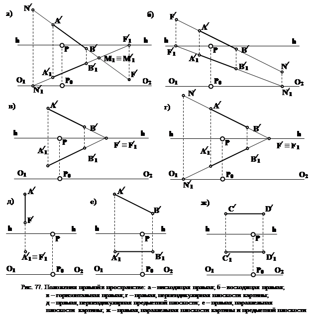 - когда прямая параллельна плоскости картины (П/), ее вторичная проекция параллельна основанию картины(O1 –O2) (рис.77, е).