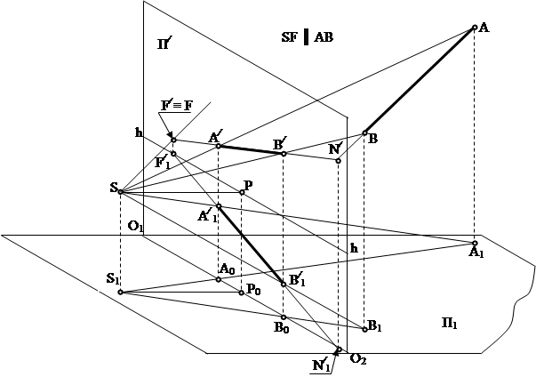 F/ - перспектива бесконечно удаленной точки F, принадлежащей прямой АВ; F/ находится на пересечении линии проекционной с из F/ с продолжением прямой А/В/ (вторичная проекция F1/ точки F находится как точка пересечения А1/ В1/ с линией горизонта h – h);