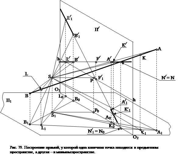 6. Если конечные точки прямой лежат в предметной части пространства или в промежуточном пространстве, то перспектива и вторичная проекция прямой выполняются сплошными основными линиями, проводимыми соответственно между перспективами и вторичными проекциями конечных точек прямой (см. рис. 78);