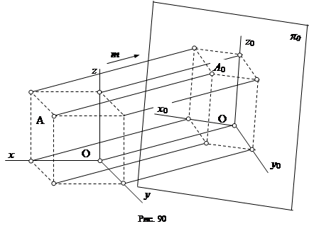 Как правило, аксонометрические проекции образуются путем параллельного проецирования, причем направление проецирования не параллельно ни одной из осей проекций. На рис. 90 показано получение аксонометрической проекции некоторой точки А пространства. Указанная точка А отнесена к системе трех взаимно перпендикулярных плоскостей, пересекающихся по осям x, y и z. По направлению (вектору) m координатная система вместе с точкой А спроецирована на произвольную плоскость проекций p0, где и получена ее аксонометрическая проекция А 0.