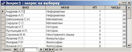 После завершения конструирования запроса, его можно открыть для просмотра. Форма просмотра запроса — табличная. Однако, это таблица виртуальная, т.е. формируемая в оперативной памяти при открытии запроса. Например, для окна конструктора, показанного выше, получим следующую таблицу: