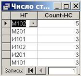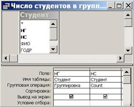 На панели инструментов нажмем кнопку Групповые операции — в бланк запроса будет добавлена соответствующая строка. Заменим слово Группировка в столбце НС на функцию Count. Сохраним запрос под именем Число студентов в группах. При открытии запрос на выборку должен иметь следующий вид:
