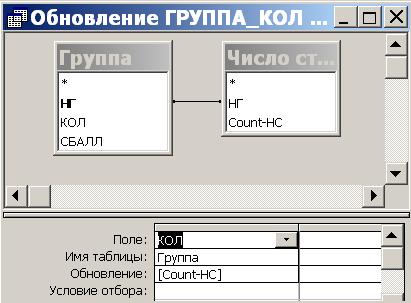 - Преобразуем запрос на выборку в запрос на обновление. Для этого выполним команду меню Запрос/Обновление. В строке Обновление введем имя поля [Count-НС] таблицы Число студентов, из которой выбираются значения для обновления.