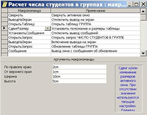 В столбце Примечания записаны комментарии к макрокомандам. В зависимости от выбранной макрокоманды меняется нижняя часть окна конструктора — Аргументы макрокоманды. На рисунке активна макрокоманда СдвигРазмера, которая устанавливает положение и размеры окна таблицы Группа, демонстрируемого после ее обновления.