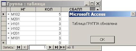 Пусть необходимо рассчитать количество студентов в группах и внести эти данные в поле КОЛ таблицы ГРУППА. Подсчет количества студентов реализован запросом Число студентов в группе. Обновление поля КОЛ на основе полученных в этом запросе данных выполняет запрос Обновление ГРУППА_КОЛ. Последовательное выполнение этих запросов решает поставленную задачу.
