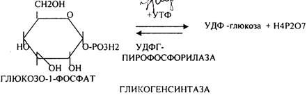 ГЛИКОГЕНСИНТАЗА - ТРАНСФЕРАЗА, которая переносит остатки глюкозы, входящие в УДФ- глюкозу, на ГЛИКОЗИДНУЮ связь остаточного в клетке гликогена, при этом образуется альфа(1,4)-ГЛИКОЗИДНЫЕ связи. Образование альфа(1,6)-ГЛИКОЗИДНЫХ связей в точках ветвления гликогена катализирует специальный ГЛИКОГЕН-ВЕТВЯЩИЙ фермент. Образовавшийся в последней реакции УДФ, превращается в УТФ, при этом поглощается I молекула АТФ. На каждую молекулу глюкозы, включающуюся в структуру гликогена, расходуется 2 молекулы АТФ. Гликоген в клетках накапливается во время пищеварения и рассматривается как резервная форма глюкозы, которая используется клетками в промежутках между приёмами пищи.