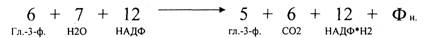 Было установлено, что за счёт ГЕКСОЗОМОНОФОСФАТНОГО пути клетки на 100% обеспечиваются ПЕНТОЗАМИ, на 50% - молекулами НАДФ*Н2. Баланс окислительной и неокислительной стадий ПЕНТОЗНОГО пути превращения ПЕНТОЗЫ можно записать в виде суммарного уравнение: