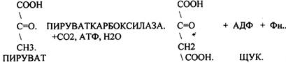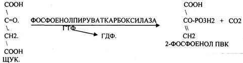 ГЛЮКОНЕОГЕНЕЗ - это биосинтез глюкозы из не углеводных предшественников, главными из которых являются ПИРУВАТ, ЛАКТАТ, ГЛИЦЕРИН, ряд АК (АСП, ФЕН, АЛА, ТИР, ТРИ, ВАЛ, ЛЕЙ, ИЛЕ, МЕТ, ПРО, ГИС, АРГ), тем или иным путем превращающиеся в метаболит ЦТК - ФУМАРАТ, который в дальнейшем превращается в ЩУК. Другие АК превращаются в ПИРУВАТ –субстрат ГЛЮКОНЕОГЕНЕЗА, ГЛЮКОНЕОГЕНЕЗ возможен не во всех тканях. Главным местом синтеза глюкозы является печень, в меньшей степени процесс идёт в почках и слизистой кишечника. ГЛЮКОНЕОГЕНЕЗ обеспечивает синтез глюкозы, а также возврат ЛАКТАТА, образованного в реакциях анаэробного ГЛИКОЛИЗА, в клеточный фонд углеводов. За счет этого процесса поддерживается уровень глюкозы при углеводном голодании, сахарном диабете. Большинство реакций ГЛЮКОНЕОГЕНЕЗА представляют собой обратные реакции ГЛИКОЛИЗУ, за исключением трёх (ГЕКСОКИНАЗНОЙ, ФОСФОФРУКТОКИНАЗНОЙ, ПИРУВАТКИНАЗНОЙ), которые при ГЛКЖОНЕОГЕНЕЗЕ имеют обходные пути. Первая обходная реакция ГЛЮКОНЕОГЕНЕЗА связана с образованием 2-ФОСФОЕНОЛ ПВК и протекает в две стадии: