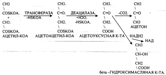 Наиболее грозным заболеванием, ведущим к нарушению углеводного обмена, является сахарный диабет. В ПЖЖ в В -клетках синтезируется белок - инсулин, который обеспечивает транспорт глюкозы из крови в ткани. В случае недостаточной выработки инсулина развивается ГИПЕРГЛЮКОЗЕМИЯ, ГЛЮКОЗУРИЯ, КЕТОНУРИЯ. В клетках развивается энергетический голод, который компенсируется за счёт процессов ГЛЮКОНЕОГЕНЕЗА и усиления процессов окисления белков и жиров, что сопровождается избыточной продукцией АЦЕТИЛ-КОА, NH3. NH3 токсичный продукт, для связывания которого откликаются основные КЕТОКИСЛОТЫ цикла КРЕБСА, а это в свою очередь понижает интенсивность окислительных процессов и создаёт предпосылки для конденсации АЦЕТИЛ-КОА и образования кетоновых тел (АЦЕТОУКСУСНАЯ К-ТА, АЦЕТОН, бета -ГИДРОКСИМАСЛЯНАЯ К-ТА).