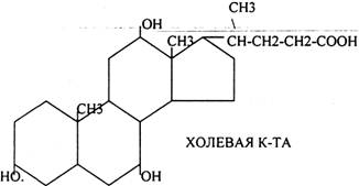 Особую роль в переваривании играют желчные кислоты. Все они образуются в печени и являются конечным продуктом окисления холестерина в организме. В основе их строения лежит структура ЦИКЛОПЕНТАНПЕРГИДРОФЕНАНТРЕН.