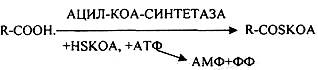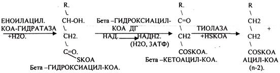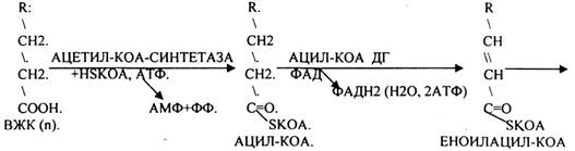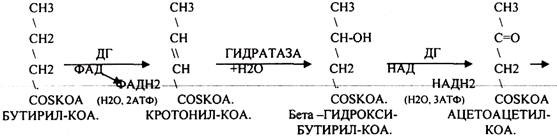 Окисление ВЖК в тканях изучалось Ф. КНООПОМ (1904г.), который назвал окисление ВЖК бета- окислением. Он показал, что процесс этот циклический, что все ВЖК, имеющие чётное количество углеродных звеньев в цепи обязательно проходят окисление, когда цепь периодически укорачивается на 2 углеродных звена. Последняя стадия окисления - стадия превращения масляной кислоты имеет свои особенности, когда в результате 1 цикла окисления образуется 2 молекулы АЦЕТИЛ-КОА. Одна проходит окисление с выделением 5 АТФ, а другая нет.