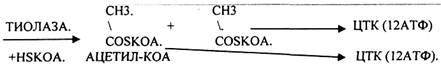 Т.о. завершая 1 цикл бега -окисления ВЖК, в результате которого ВЖК укоротилось на 2 углеродных звена. При бета -окислении выделилось 5АТФ и 12АТФ выделилось при окислении АЦЕИЛ-КОА в ЦТК и сопряженных с ним ферментов дыхательной цепи. Окисление ВЖК будет происходить циклически одинаково, но только до последней стадии - стадии превращения масляной кислоты (БУТИРИЛ-КОА), которая имеет свои особенности. Их надо учитывать при подсчёте энергетического эффекта окисления ВЖК, когда в результате одного цикла образуется 2 молекулы АЦЕТИЛ-КОА, одна из них проходила бета -окисление с выделением 5АТФ, а другая нет.