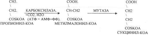 ВЖК, имеющие нечётное количество углеродных звеньев, поступают в организм человека в составе пищи. Окисление таких ВЖК происходит также как и ВЖК, имеющих чётное количество углеродных звеньев в цепи, но только до последней стадии - стадии превращения ПРОПИОНИЛ-КОА. которая имеет свои особенности: