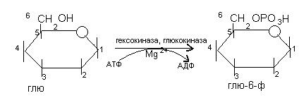 I. 1. Фосфорилирование глюкозы: реакция протекает необратимо, катализируется гексокиназой и требует затраты АТФ: