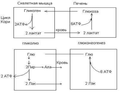 Синтез глю из малых молекул предшественников идет в период после восстановления после мышечной нагрузки, например после бега на сто метров. В этом случая в качестве источника энергии служит гли, который окисляется с образованием лак и выделением АТФ. Т.к. кислорода в тканях не хватает, лактат не может подвергаться дальнейшим превращениям и поступает в кровь.