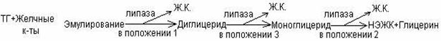 Переваривание ТГ начинается в 12-перстной кишке, после их эмульгирования желчными кислотами.