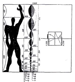 «Если бы появился какой-нибудь линейный измеритель, подобный системам музыкальной записи, не облегчился бы ряд проблем?» И в качестве такового предлагает свой модулор. Модулор - это такой измерительный прибор, в основе которого лежит человеческий рост и математика. На рис. 16 показан этот прибор. В его основу заложены рост человека и золотое сечение. Здесь исходные единицы измерения связаны с членением человека. Они закономерно увеличиваются и уменьшаются вверх и вниз. Каждое последующее членение связано с предыдущим золотым сечением. На вопрос о достоинствах модулора Корбюзье отвечал: «Метр - это цифры без реального содержания: сантиметр, дециметр, метр - это только обозначение десятичной системы. Цифры модулора - это действительно размеры. Они - факты. Они являются результатом выбора между бесконечным количеством величин». Корбюзье разработал систему предпочтительных чисел, ввел в систему наших измерений два начала - человеческое и эстетическое. Эйнштейн сравнивал модулор с гаммой пропорций, которая «делает плохое трудным, а хорошее легким». Корбюзье писал: «Модулор -это гамма. Музыкант располагает гаммой и создает музыку по своим способностям - банальную или красивую». Модулор - гамма. Но гамма - это еще не музыка.