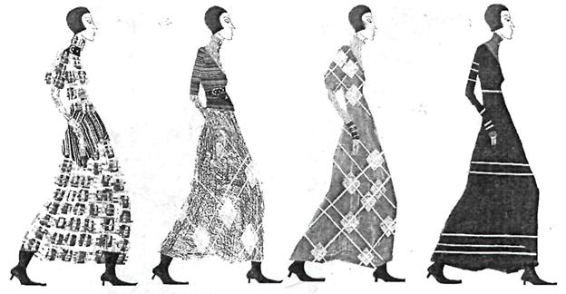 Ощущение пропорций юбки изменяется в зависимости от изображения на ней различных геометрических фигур и их масштаба. Если одну из частей формы заполнить тематическим рисунком, наполненным интересным содержанием, то эта деталь привлечет тс себе большее внимание. Она • восприниматься иначе, так как выделиться из ряда аналогичных деталей, лишенных рисунка, и будет казаться больше или меньше (в зависимости от характера рисунка, цвета и пр.).