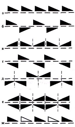 Обязательным элементом симметрии любого линейного орнамента является ось переносов. Существуетсемь видов симметрии линейных орнаментов (рис. 49, а - д). Линейныеорнаменты, в зависимости от вида симметрии, производят разное впечатление на зрителя. Асимметричные мотивы придают им то или иное «движение», делают их «неустойчивыми», симметричные – кажутся спокойными, неподвижными, устойчивыми. Как отмечает проф. А. А. Нешатаев, в трикотажных полотнах часто встречаются антисимметричные решения орнаментальных композиций. В этом случае фигура, окрашенная в один цвет, может быть равна