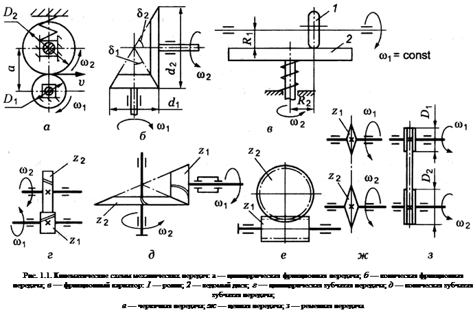 Фрикционные передачи (передачи трением) — передачи, в которых передача движения осуществляется силами трения. Для создания трения в контакте катков применяют пружины и специальные нажимные и натяжные устройства. На рис. 1.1 а, б изображены фрикционные передачи непосредственным контактом, на рис. 1.1, в вариатор — фрикционная передача с бесступенчатым регулированием скорости за счет смещения ролика 1, на рис. 1.1, з передача гибкой связью — ременная.