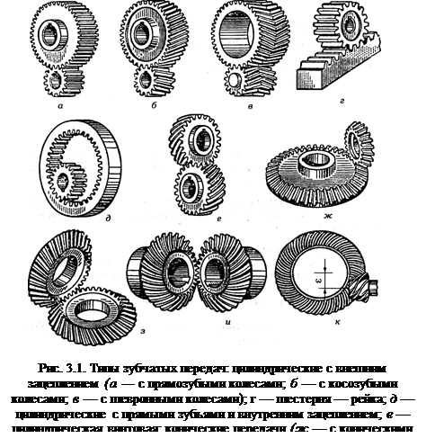 Зубчатые передачи применяют при любом расположении осей колес. При параллельном расположении осей колес используют цилиндрическую передачу, при пересекающихся осях — коническую передачу, при скрещивающихся осях валов — винтовые, гипоидные, спироидные (рис. 3.1).