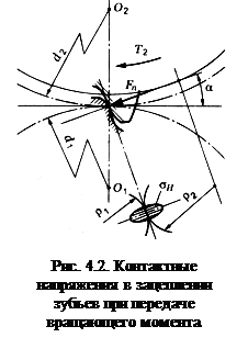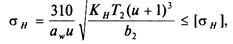 Размеры зубчатой передачи определяют из расчета (проектировочный расчет) по контактным напряжениям (рис. 4.2). За основу принимают формулу Герца для контакта цилиндрических поверхностей. После соответствующих преобразований и введения различных коэффициентов, учитывающих особенности геометрии зуба и характер действующей нагрузки, получают формулу для определения основного геометрического параметра зубчатой цилиндрической передачи — межосевого расстояния, мм:
