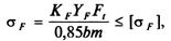 где KF — коэффициент нагрузки; Yf — коэффициент формы зуба, выбирается по числу зубьев z0, Ft — окружная сила; b — ширина зубчатого венца; т — модуль зуба в среднем сечении.