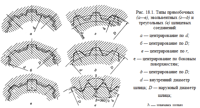 По форме боковых поверхностей зубья шлицевых соединений выполняют прямобочными, эвольвентными и треугольными (рис. 18.1).