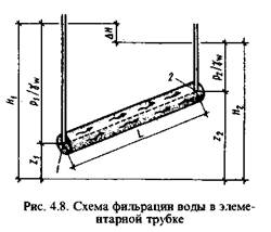 Рассмотрим схему фильтрации воды в элементе грунта (рис. 4.8). Пусть в точках 1 и 2 слоя водонасыщенного грунта, удаленных друг от друга на расстояние L, действуют разные пьезометрические напоры: H1>H2. Напомним, что из курса гидравлики напор в любой точке движущегося потока воды определяется выражением