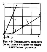 Начальный градиент напора. Многочисленные опыты по фильтрации воды в песчаных грунтах подтверждают полную справедливость закона Дарси (кривая 1 на рис. 4.9). Вместе с тем опыты с глинистыми грунтами показывают систематическое отклонение от этого закона (кривая 2). Так, в глинистых грунтах, особенно плотных, при относительно небольших значениях градиента напора фильтрации может не возникать (начальный участок кривой 2). Увеличение градиента приводит к постепенному, очень медленному развитию фильтрации. Наконец, при некоторых значениях гидравлического градиента устанавливается постоянный режим фильтрации.