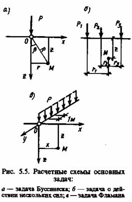 Представляет также интерес решение для вертикальной сосредоточенной силы Р в условиях плоской задачи (рис. 5.5, в), полученное Фламаном в 1892 г. в виде