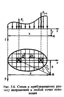 Очевидно, что для элементов, прилегающих к контуру нагрузки, размеры площадей должны быть уточнены в соответствии с сеткой разбивки. Тогда от каждой силы Pi напряжение σzi в точке М, находящейся на глубине z от поверхности нагружения, определится но формуле σzi=Ki/z2Pi, где г2i=х2i+у2i. Очевидно, что для определения полного напряжения σz от действия всех элементарных сил необходимо выполнить суммирование по площади загружения.
