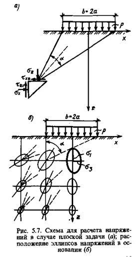 Плоская задача. Действие равномерно распределенной нагрузки. Схема для расчета напряжений в основании в случае плоской задачи при действии равномерно распределенной нагрузки интенсивностью р показана на рис. 5.7, а. Для этого случая Г. В. Колосовым получено следующее точное выражение для определения σz в любой точке упругого полупространства: