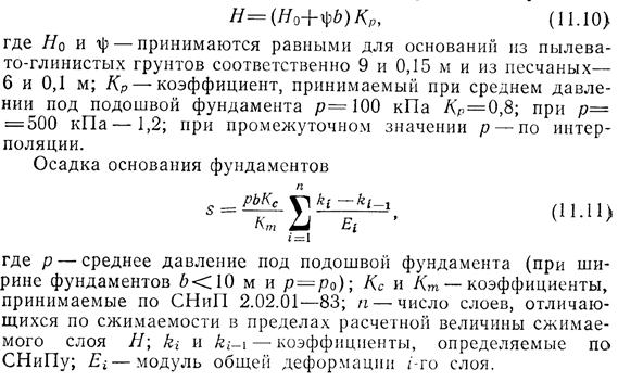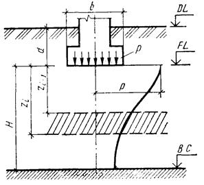 Рис. 5.3. Схема распределения вертикальных напряжений при расчете осадок с использованием расчетной схемы в виде линейно-деформируемого слоя конечной толщины: