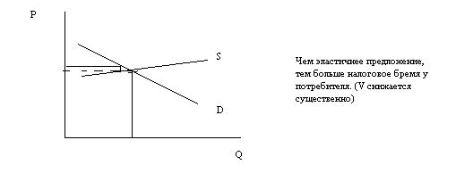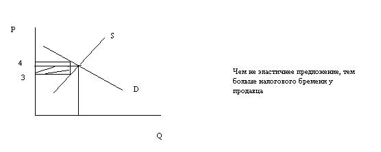 1) Чем менее эластичен спрос на товар, тем большую часть бремени налога производитель переносит на покупателя, при условии, что предложение постоянно.