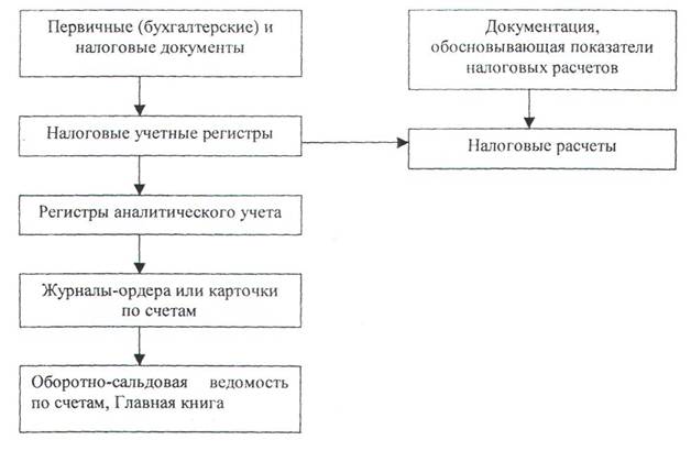 Специфической особенностью налогового учета является то, что все начисленные и оплаченные в бюджет и во внебюджетные фонды налоги и платежи в обязательном порядке отражаются на счетах и в регистрах бухгалтерского учета. Поэтому политикой налогового учета необходимо предусмотреть всю последовательность обработки налогово-учетной информации, начиная с первичных бухгалтерских и налоговых документов и заканчивая регистрами аналитического и синтетического учета.