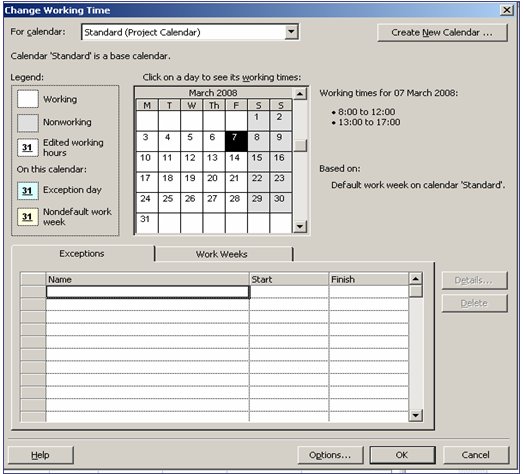 По умолчанию для проекта в качестве основного календаря задается Стандартный. Можно выбрать другой календарь, создать новый календарь или отредактировать уже имеющийся: задать в нем праздничные и укороченные дни, изменить рабочее время и т.д.