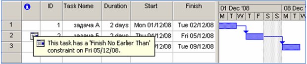 Изменять ограничения, предлагаемые по умолчанию, можно, например, вводя дату начала или окончания задачи в представлении Диаграмма Ганта. Сразу после этого в поле " Индикаторы" (Indicators) отображается специальный значок, указывающий на наличие у задачи ограничения. При подведении указателя мышки к такому значку, появляется пояснение " Эта задача имеет ограничение Окончить Не Позднее"