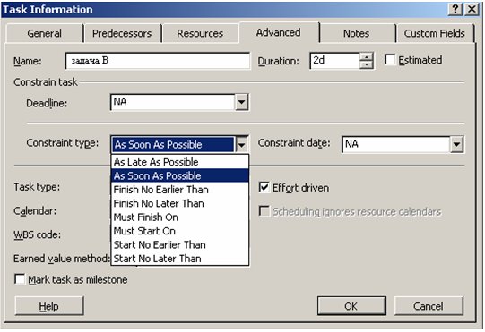 Ограничение может быть установлено с помощью диалогового окна " Информация о задаче" (Task Information). Для отображения диалогового окна необходимо сделать двойной щелчок на названии задачи или, выделив задачу, щелкнуть кнопку " Информация о задаче" (Task Information) на панели Стандартная. В диалоговом окне необходимо перейти на вкладку " Дополнительно" (Advanced), в раскрывающемся списке " Тип ограничения" (Constraint type) выбрать нужный тип ограничения, в списке Дата ограничения (Constraint date) - указать дату. Для отмены ограничения необходимо указать для задачи одно из гибких ограничений - КМР (ASAP) или КМП (ALAP), в зависимости от способа планирования.
