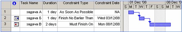 В представлении Диаграмма Ганта можно создавать или изменять ограничения с помощью таблицы Даты Ограничений (Constraint Dates)